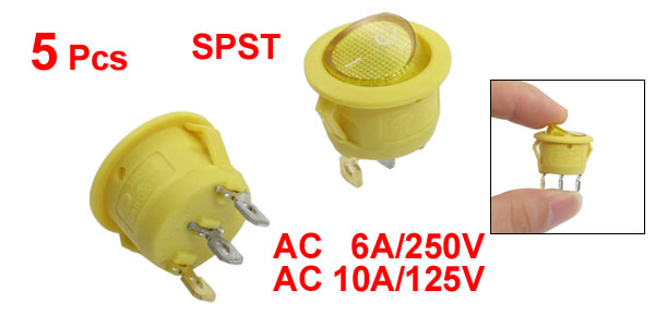 5 Pcs SPST On/Off Yellow Neon Lamp Round Rocker Switch AC 6A/250V 10A/250V