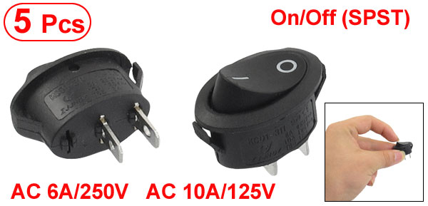 Item Name Rocker Switch Type On/Off (SPST) Terminals 2 Pin Voltage & Current AC 6A/250V, AC 10A/125V Overall Size ~27 x 25 x 17cm / 1.1" x 1" x 0.7"(L*W*T) Mounting Hole Size 21.7 x 12.9mm / 0.85" x 0.51"(L*W) Color Black Material Plastic & Metal Total Net Weight 16g Package Content 5 x Rocker Switch - Reviews