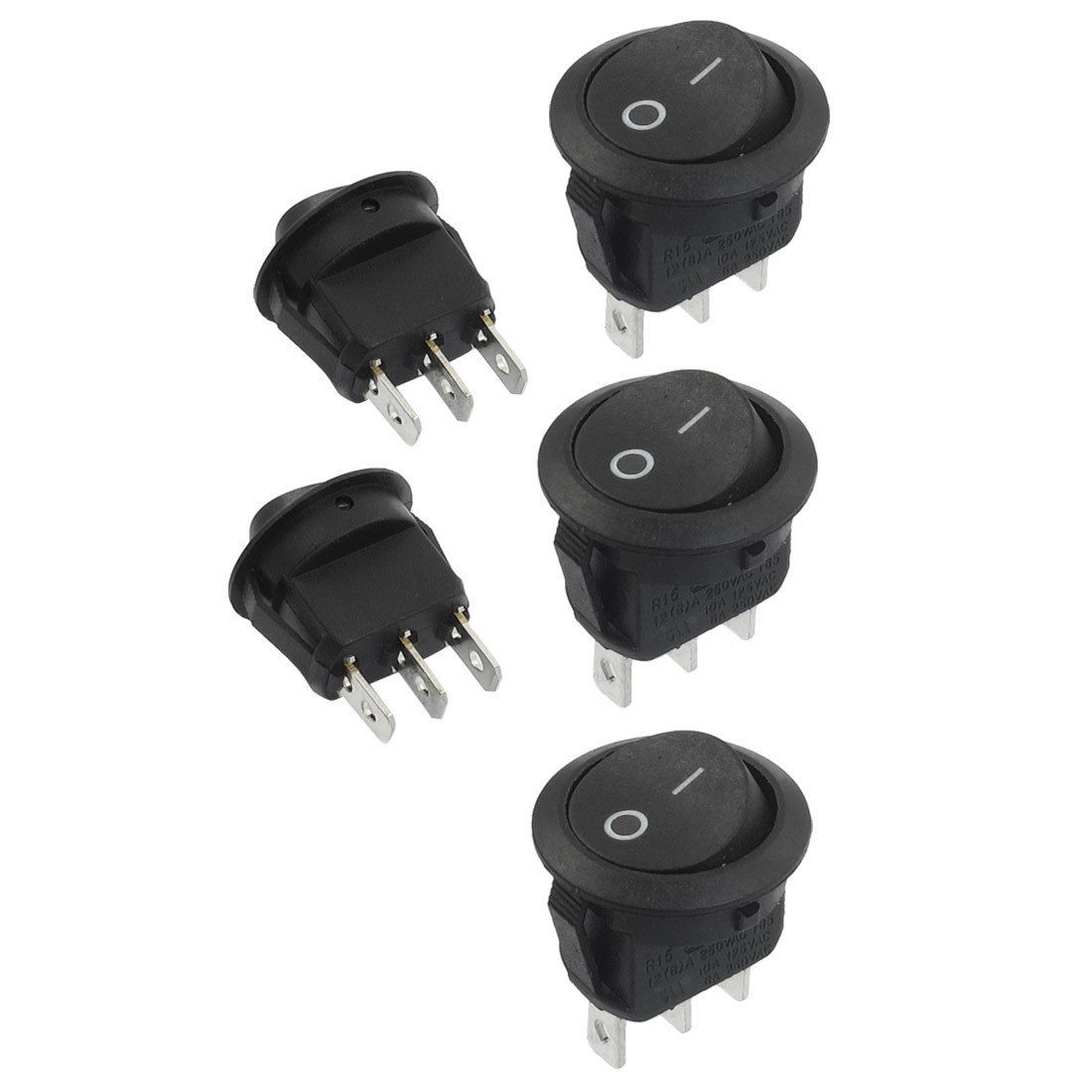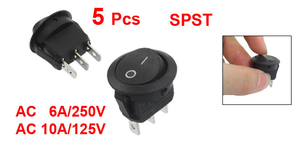 5 Pcs SPST Round Black On/Off Rocker Switch AC 250V/6A 125V/10A