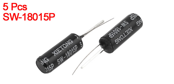 Details5 Pcs SW-18015P Single Bead Vibration Sensor Switch Black  Product Name Vibration Sensor Switch Model Number SW-18015P Max.Voltage <12VDC Rated Thermal Current <5mA Insulation Resistance >10M Ohm Max.Temperature Resisting 100C Body Dimension 4.5 x 11.5mm/0.18" x 0.45"(D*L) Pin Length 13mm/ 0.51" Pin Diameter (Max) 0.4mm/0.016" Net Weight 3g Package Content 5 x Vibration Sensor Switch