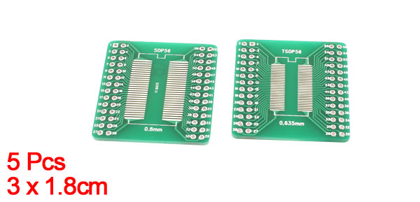 Product Name PCB Adapter Converter Type TSOP56 0.635mm SOP56 0.8mm to SDRAM56 2.54mm Size 3 x 1.8cm / 1.2" x 0.7"(L*W) Color Green Weight 21g Package Content 5 x PCB Adapter Converter - Reviews