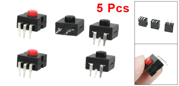 Product Name Torch Push Button Switch Contact Type Latching Contact Voltage/ Current AC 250V 1.5A Pin Number 3(Single Row) Terminal Driection Vertical, Horizontal Overall Size 12 x 12 x 8mm/ 0.47" x 0.47" x 0.31" (L*W*H) Button Diameter 5mm/ 0.2" Material Plastic, Metal, Electric Parts Color Black, Silver Tone, Red Net Weight 7g Package Content 5 x Torch Push Button Switch - Reviews