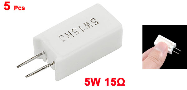 Product Name Cement Resistor Body Material Ceramic, Cement Power 5W Resistance 15 Ohm Tolerance ±5% Body Size (Approx.) 25 x 13 x 9mm/1'' x 0.5'' x 0.35'' (L * W * H) Pin Size (Approx.) 11 x 0.7mm / 0.43'' x 0.03"(L*D) Pin Spacing 5mm/0.2'' Color White Weight 33g Package Content 5 x Cement Resistors - Reviews