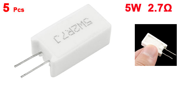 Product Name Cement Resistor Body Material Ceramic, Cement Power 5W Resistance 2.7 Ohm Tolerance ±5% Body Size (Approx.) 25 x 13 x 9mm/1'' x 0.5'' x 0.35'' (L * W * H) Pin Size (Approx.) 11 x 0.7mm / 0.43'' x 0.03"(L*D) Pin Spacing 5mm/0.2'' Color White Weight 33g Package Content 5 x Cement Resistors - Reviews