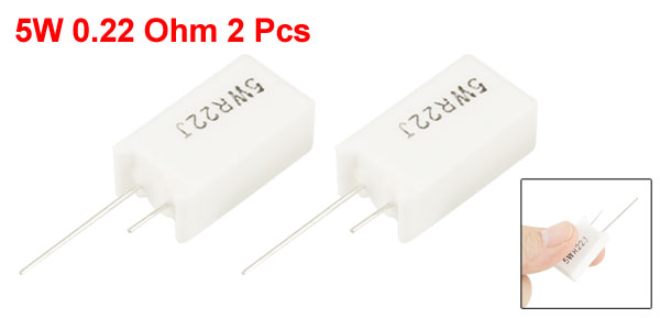 Product Name Cement Resistor Body Material Ceramic, Cement Power 5W Resistance 0.22 Ohm Tolerance +/-5% Body Size (Approx.) 25 x 13 x 9mm/1'' x 0.5'' x 0.35'' (L * W * H) Pin Size (Approx.) 11 x 0.7mm / 0.43'' x 0.03"(L*D) Pin Spacing 5mm/0.2'' Color White Weight 32g Package Content 5 x Cement Resistors - Reviews