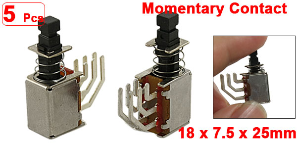 Product Name Push Button Switch Model No. PS22F27 Contact Type Momentary Contact Total Size 18 x 7.5 x 25mm/ 0.71" x 0.29" x 0.98" (L*W*H) Pin Width 1mm/ 0.039" Pin Pitch 1.5mm/ 0.059" Material Plastic, Metal Color Black, Silver Tone Net Weight 12g Package Content 5 x Tact Switches - Reviews