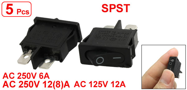 Product Name Rocker Switch Poles SPST Terminals 2 Pins Position On/Off Two Position Rated Voltage & Current AC 250V, 12(8)A AC 125V, 12A AC 250V, 6A Overall Size(Approx.) 21 x 9.4 x 30mm / 0.83" x 0.37" x 1.18"(L*W*H) Mounting Size 18.5 x 6.5 x 14mm / 0.73" x 0.26" x 0.55"(L*W*Depth) Color Black Material Plastic, Electronic Parts TWeight 13g Package Content 5 Pcs x Rocker Switches - Reviews