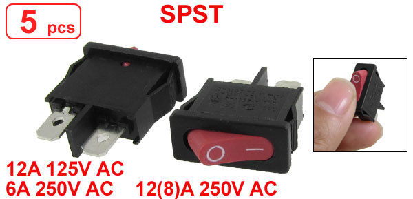 Product Name Rocker Switch Poles SPST Terminals 2 Pin (On - Off) Voltage 12A 125V AC 6A 250V AC 12(8)A 250V AC Total Size(Each One) 2.1 x 0.9 x 3cm/0.8'' x 0.4'' x 1.2''(L*W*H) Mounting Dimension 1.8 x x 0.6 x 2.3cm/0.7'' x 0.2'' x 0.9''((L*W*Depth) Color Black, Red Material Plastic & Metal Total Weight 13g Package Content 5 x Rocker Switch - Reviews