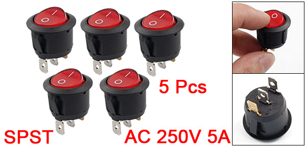 Details5 Pcs x Red Light 3 Pin ON-OFF SPST Round Boat Rocker Switch 6A/250V 10A/125V AC  Product Name Rocker Switch Type On Off, SPST Terminals Number 3 Rating Voltage AC 250V 5A AC 125V 10A Total Size(Each) 20 x 25.7mm/ 0.8" x 1"(D*H) Mounted Size 22.4 x 23.5 mm/ 0.88" x 0.92" (L*H) Pin Size 8 x 5mm /0.3" x 0.2"(L*W) Pin Spacing 7.6mm/ 0.299" Color Black, Red Button Material Plastic, Metal Weight 24g Package Content 5 x Rocker Switches