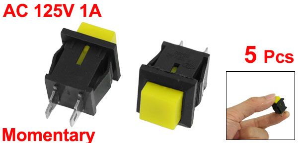 Item Name Push Button Switch Control Type Momentary Voltage AC 125V 1A Main Color Yellow, Black Pin Pitch 5.8mm / 0.23" Button Size 0.9 x 0.9cm/ 0.3" x 0.3" (L*W) Total Size 2.5 x 1.4 x 1.4cm/ 1" x 0.55" x 0.55" (L*W*T) Mounting Size 1.2 x 1.05 x 1.2cm / 0.47" x 0.4" x 0.47"(L*W*H) Material Plastic, Electric Parts Net Weight 14g Package Content 5 x Push Button Switch - Reviews