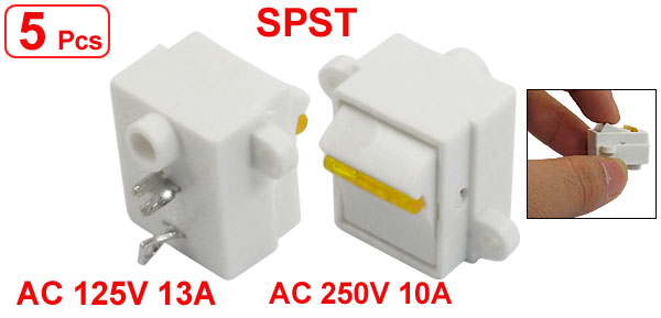 Total Size(Each) 21 x 27 x 21mm/ 0.83" x 1.06" x 0.83"(L*W*H) Mounted Size 20 x 17mm/ 0.79" x 0.67"(L*W) Hole Dia. 2.5mm/ 0.1" Color Yellow, White Material Plastic, Metal Weight 22g Package Content 5 x Rocker Switches - Reviews