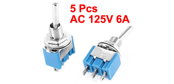 Details5 Pieces AC 125V 6A ON/ON 2 Position 3Pin SPDT Toggle Switch Blue  Product Name Toggle Switch Model MTS102 Rated Voltage/Current AC 125V 6A Action Type 2 Positions (ON/ON), 1NO 1NC Contact Type SPDT Pin Pitch 4mm/ 0.16" Body Size (Approx.) 13 x 8 x 10mm/ 0.51" x 0.31" x 0.39" (L*W*H) Material Plastic, Metal Color Blue Weight 23g Package Content 5 x Toggle Switch