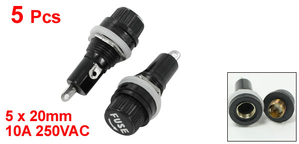Item Name Panel Mounted Fuse Holder Fit for 5 x 20mm / 0.2" x 0.8" Fuses Maxi. Withstand 10A 250VAC Material Plastic and Metal Color Black Size 1.6 x 4cm / 0.63" x 1.6" ( Inner Diameter x Length) Weight 27g Package Content 5 x Panel Mount Fuse Holder - Reviews