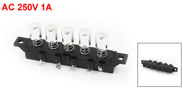 Product Name Interlock Push Button Switch Type 5 Keys 4 Poles Button Number 5 Voltage/ Current AC 250V 1A Overall Size 111 x 14 x 40mm/ 4.4" x 0.55" x 1.6" (L*W*T) Mount Hole Dia 6mm/ 0.24" Push Button Dia(Each) 1.2cm/0.47" Material Metal, Electronic Part Color Black, Silver Tone Net Weight 30g Package Content 1 x Interlock Push Button Switch - Reviews
