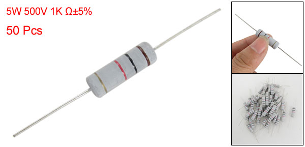 Product Name Metal Oxide Film Resistors Quantity 50 ± 2% Pcs Power Rating 5W Withstang Voltage 500V Resistance Tolerance ± 5% Resistance Value 1K Ω Size (Approx.) 8.2 x 0.7cm/ 3.2" x 0.3" (L*Max.D) Color As Picture Show Weight 186g Package Content 50 Pcs x Metal Oxide Film Resistors - Reviews