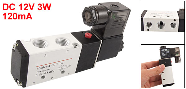 Details5 Way 2 Position DC 12V 3W 120mA Solenoid Valve 4V210-08 Cpsue  Product Name Solenoid Valve Model 4V210-08 Working Pressure 0.15~0.8Mpa Operating Temperature 35°C Power Consumption DC 12V, 3W Current 120mA Position & Way Number Two-position, Five-way Female Thread Port Diameter 11.4mm / 0.448", 8mm / 0.315" Joint Pipe Bore Inlet=Outlet=1/4'' Total Size 11.8 x 6.6 x 2.2cm/4.6'' x 2.6'' x 0.87"(L*W*H) External Material Metal, Plastic Color White, Black Net Weight 193g Package Content 1 x Solenoid Valve
