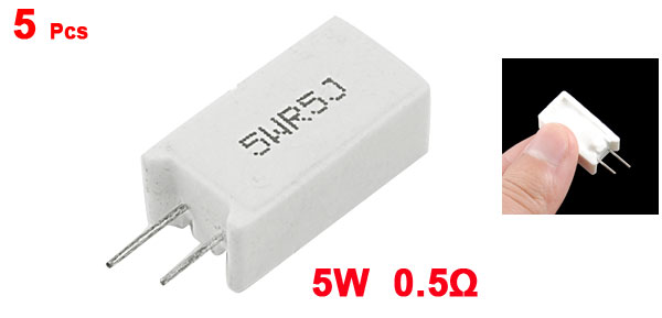 Product Name Cement Resistor Body Material Ceramic, Cement Power 5W Resistance 0.5 Ohm Tolerance ±5% Body Size (Approx.) 25 x 13 x 9mm/1'' x 0.5'' x 0.35'' (L * W * H) Pin Size (Approx.) 11 x 0.7mm / 0.43'' x 0.03"(L*D) Pin Spacing 5mm/0.2'' Color White Weight 33g Package Content 5 x Cement Resistors - Reviews