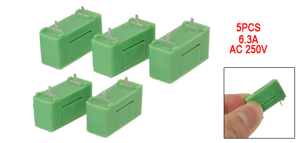 Product Name PCB Fuse Holder Model PTF-77A Fit for Fuse 5 x 20mm Rated Current 6.3A Rated Voltage 250V Power 1.6W Total Size 24 x 9 x 17mm/0.94'' x 0.35'' x 0.67'' (L*W*H) Pin Distance 23mm/0.9'' Material Plastic Color Green Net Weight 9g Package Content 5 x PCB Fuse Holder - Reviews