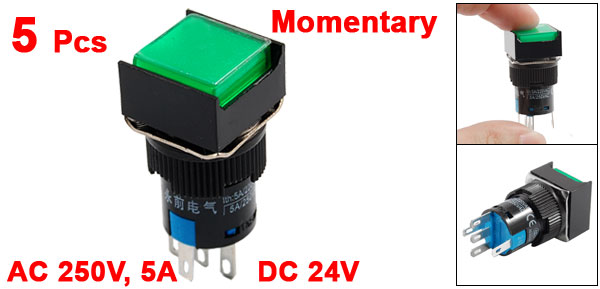 Item Name Push Button Switch Type Momentary, 1NO 1NC Ith AC 220V, 5A Switching Voltage AC 250V, 5A Light Voltage 24V Light Color Green Button Size 15 x 15mm/0.6" x 0.6" (L*W) Thread Diameter 15.6mm/0.61" Size 17 x 17 x 40mm/0.7" x 0.7" x 1.5" (L*W*H) Material Plastic, Metal Weight 36g Package Content 5 x Push Button Switch - Reviews
