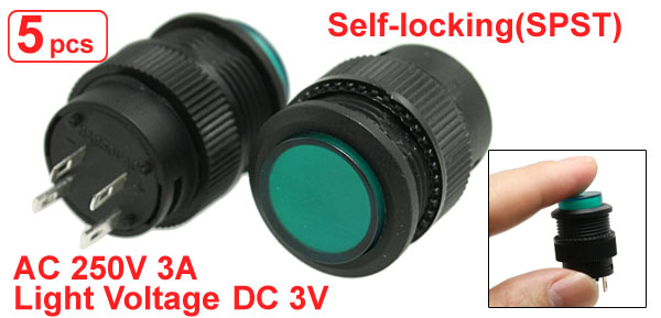 5 x 3A 250V AC SPST On/Off Latching NO Round Push Button Switch w Green Light