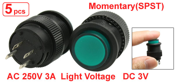 5 x 3A 250V AC SPST On/Off Momentary NO Round Push Button Switch w Green LED Lig