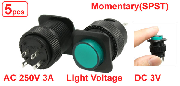 Item Name Push Button Switch Model R16-503/BD Contact Type Normally Open, SPST Action Type Momentary Working Voltage AC 250V Working Current 3A Light Voltage DC 3V Light Color Green Mounting Thread Diameter 16mm / 0.63" Button Cap Diameter 13mm / 0.5" Terminals 4 Overall Size 18 x 18 x 30mm / 0.7" x 0.7" x 1.2" (L*W*H) Material Plastic, Electronic Parts Weight 24g Package Content 5 Pcs x Illuminated Round Push Button Switch - Reviews