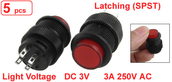 Item Name Push Button Switch Type Self Latching (SPST) Contact Type NO Rating Voltage 3A 250V AC Light Voltage DC 3V Terminals 4 Pin Light Color Red Cap Dia. 13mm/0.51'' Pin Space Pitch 6.3mm/0.25'' 5mm/0.2'' Thread Dia. 15mm/0.59'' Total Size 29 x 18mm/1.14'' x 0.71'' (L*Max.D) Material Plastic, Metal Weight 25g Package Content 5 x Push Button Switch - Reviews