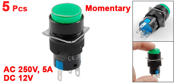 5 x 5 Pin Momentary 1NO 1NC Green Neon Light Round Push Button Switch DC 12V