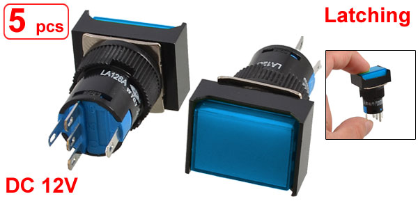 5 x 5 Pin Terminals Blue Lamp Latching Rectangular Push Button Switch DC 12V