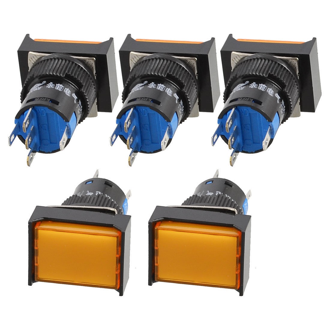 Item Name Push Button Switch Contact Type 1NO, 1NC Switch Type Latching Type Switch Working Voltage AC 250V, 5A Lamp Voltage DC 12V Thermal Current(Ith) AC 220V 5A Lamp Cap Color Orange Switch Color Black, Orange Pin Number 5 Button Size 20 x 14mm/ 0.8" x 0.55" (L*W) Mounting Thread Dia. 16mm/ 0.63" Total Size 24 x 18 x 40mm/ 0.94" x 0.7" x 1.6"(L*W*H) Material Plastic, Electronic Parts Weight 40g Package Content 5 x Push Button Switch - Reviews