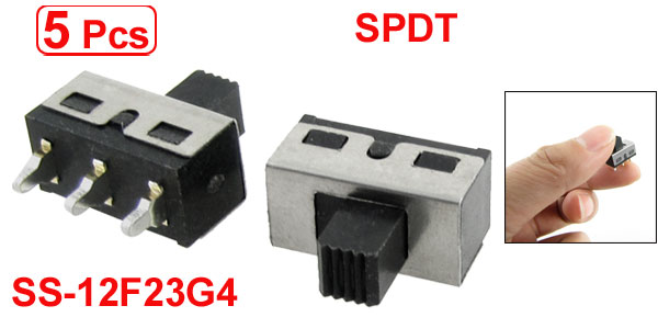 Product Name Slide Switch Model SS12F23-G4 Action Type SPDT Contact Type ON/ON, 2 Positions Pins Quantity 3 Working Power 0.5A 50V DC Contact Resistance 30mΩ Max Insulation Resistance 100mΩ Min at 500V DC Withstand Voltage AC 500V for 1 min Terminals Size(Each One) 3 x 1mm/ 0.12" x 0.04" ( L * W) Pin Pitch 4.7mm / 0.185" Main Body Size(not include Pins & Knob) 13 x 7 x 6.4mm/ 0.5" x 0.3" x 0.25" (L * W* H) Total Size 13 x 7 x 15mm/ 0.5" x 0.3" x 0.6" (L * W* H) Knob Size 4 x 4 x 5mm/ 0.16" x 0.16" x 0.19" (L * W * H) Material(External) Plastic, Metal Main Color Silver Tone, Black Weight 7g Package Content 5 x Slide Switch - Reviews