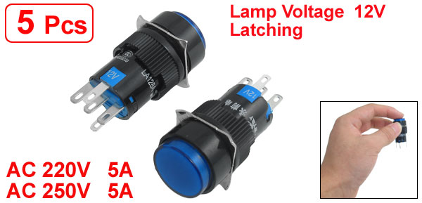 Details5 x 5P Latching 1NO 1NC Blue Neon Light Round Push Button Switch 12V  Item Name Push Button Switch Contact Type 1NO, 1NC Switch Type Latching Type Switch Working Voltage AC 250V, 5A Lamp Voltage 12V Thermal Current(Ith) AC 220V 5A Lamp Cap Color Blue Switch Color Black, Blue Pin Number 5 Button Cap Diameter 15mm/ 0.59" Mounting Thread Dia. 15.6mm/ 0.61" Total Size 18 x 18 x 41mm/ 0.71" x 0.71" x 1.6"(L*W*H) Material Plastic, Electronic Parts Weight 36g Package Content 5 x Push Button Switch