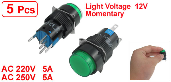 Item Name Push Button Switch Type Momentary, 1NO 1NC Ith AC 220V, 5A Switching Voltage AC 250V, 5A Light Voltage 12V Light Color Green Button Diameter 15mm/0.6'' Thread Diameter 15.2mm / 0.6'' Size 18 x 18 x 40mm/0.7'' x0.7'' x 1.6'' (L*W*H) Material Plastic, Metal Weight 35g Package Content 5 x Push Button Switch - Reviews