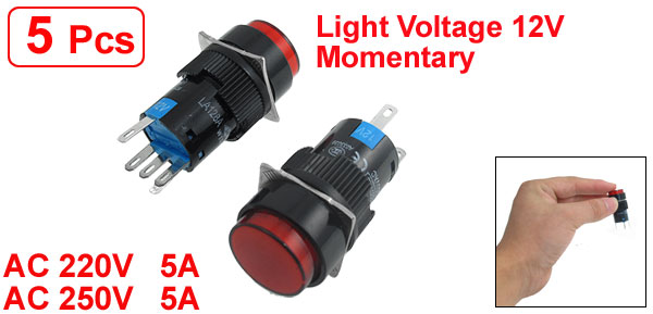 5 x 5P Momentary 1NO 1NC Red Neon Light Round Push Button Switch 12V