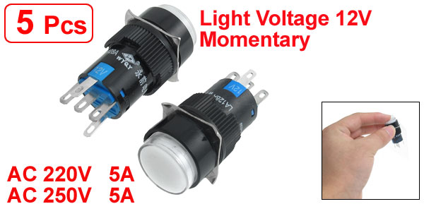 Item Name Push Button Switch Type Momentary, 1NO 1NC Ith AC 220V, 5A Switching Voltage AC 250V, 5A Light Voltage 12V Light Color White Button Diameter 15mm/0.6'' Thread Diameter 15.2mm / 0.6'' Size 18 x 18 x 40mm/0.7'' x0.7'' x 1.6'' (L*W*H) Material Plastic, Metal Weight 35g Package Content 5 x Push Button Switch - Reviews