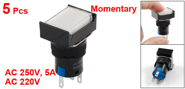 Item Name Push Button Switch Type Momentary, 1NO 1NC Switching Voltage AC 250V, 5A Light Voltage AC 220V Light Color White Button Size 20 x 15mm/0.8'' x0.6''(L*W) Thread Diameter 15.6mm/0.61'' Size 24 x 17 x 40mm/0.9'' x 0.7'' x 1.6'' (L*W*H) Material Plastic, Metal Weight 41g Package Content 1 x Push Button Switch - Reviews