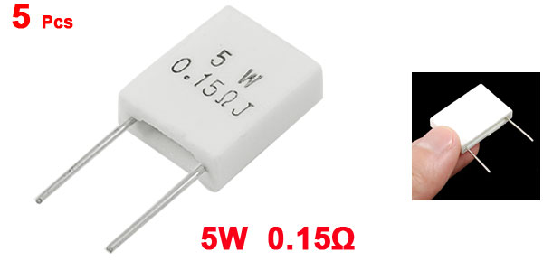 Product Name Cement Resistor Body Material Ceramic, Cement Power 5W Resistance 0.15 Ohm Tolerance ±5% Body Size (Approx.) 18 x 14 x 5mm/0.7'' x 0.6'' x 0.2'' (L * W * H) Pin Size (Approx.) 11 x 0.77mm / 0.43'' x 0.03"(L * D) Pin Spacing 10.5mm/0.41'' Color White Weight 16g Package Content 5 x Cement Resistors - Reviews