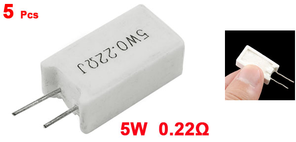 Product Name Cement Resistor Body Material Ceramic, Cement Power 5W Resistance 0.22 Ohm Tolerance ±5% Body Size (Approx.) 25 x 13 x 9mm/1'' x 0.5'' x 0.35'' (L * W * H) Pin Size (Approx.) 11 x 0.7mm / 0.43'' x 0.03"(L*D) Pin Spacing 5mm/0.2'' Color White Weight 36g Package Content 5 x Cement Resistors - Reviews