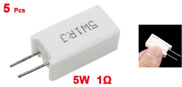 Product Name Cement Resistor Body Material Ceramic, Cement Power 5W Resistance 1 Ohm Tolerance ±5% Body Size (Approx.) 25 x 13 x 9mm/1'' x 0.5'' x 0.35'' (L * W * H) Pin Size (Approx.) 11 x 0.7mm / 0.43'' x 0.03"(L*D) Pin Spacing 5mm/0.2'' Color White Weight 33g Package Content 5 x Cement Resistors - Reviews