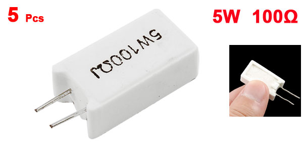 Details5 x 5W 100 Ohm 5% Radial Ceramic Cement Power Resistors  Product Name Cement Resistor Body Material Ceramic, Cement Power 5W Resistance 100 Ohm Tolerance ±5% Body Size (Approx.) 25 x 13 x 9mm/1'' x 0.5'' x 0.35'' (L * W * H) Pin Size (Approx.) 11 x 0.7mm / 0.43'' x 0.03"(L*D) Pin Spacing 5mm/0.2'' Color White Weight 33g Package Content 5 x Cement Resistors
