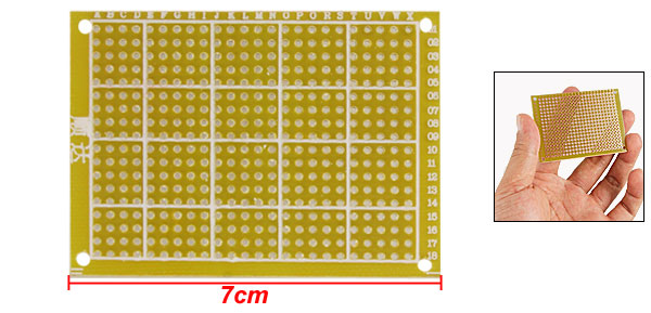 Product Name Universal PCB Board Hole Dia(Approx) 0.1cm / 0.039" Hole Pitch(Approx) 0.14cm / 0.055" Size(Approx) 5 x 7cm / 1.96" x 2.75"(L*W) Thickness(Approx) 0.1cm / 0.039“ Material FR-4 Color See the Picture Weight 7g Package Content 1 x Universal PCB Board - Reviews