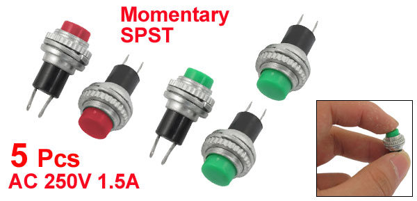 Product Name Push Button Switch Action Type Momentary Contact Type NO Poles SPST Rating Voltage AC 250V 1.5A Terminals Quantity 2 Pins Mounting Thread Dia. 9.5mm / 0.37" Button Dia. 10mm / 0.39" Terminals Pitch 4mm / 0.16" Overall Size 24 x 12mm / 0.9" x 0.42"(Max. L * D) Material Plastic & Metal Color Red, Green, Black Weight 17g Package Content 5 x Push Button Switch - Reviews