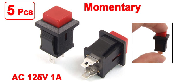 Item Name Push Button Switch Control Type Momentary Voltage AC 125V 1A Color Red, Black, Silver Tone Pin Pitch 6.8mm / 0.28" Button Size 0.9 x 0.9cm/ 0.3" x 0.3" (L*W) Total Size 2.5 x 1.4 x 1.4cm/ 1" x 0.55" x 0.55" (L*W*T) Mounting Size 1.2 x 1.05 x 1.2cm / 0.47" x 0.4" x 0.47"(L*W*H) Material Plastic, Electric Parts Net Weight 14g Package Content 5 x Push Button Switch - Reviews