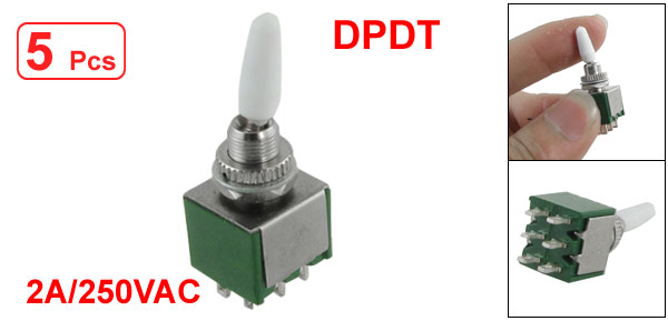 Details5 x AC 250V 2A White Handle 6 Pin DPDT ON/ON 2 Position Mini Toggle Switch  Product Name Toggle Switch Type DPDT (ON/ON) Position 2 Mounting Hole Diamter 5.8mm / 0.228" Voltage & Current 2A/250VAC Main Body Size 12.6 x 12.5mm / 0.5" x 0.49"(L*W) Overall Height 36mm / 1.4" Material Metal & Resin Main Color Green Weight 30g Package Content 5 x Toggle Switch