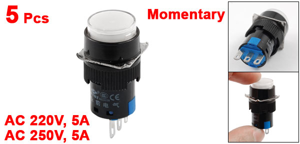 Item Name Push Button Switch Type Momentary, 1NO 1NC Ith AC 220V, 5A Voltage AC 250V, 5A Button Color White Button Diameter 15mm/0.6" Thread Diameter 15.6mm/0.61" Size 18 x 18 x 40mm/0.7" x0.7" x 1.6" (L*W*H) Material Plastic, Metal Weight 30g Package Content 5 x Push Button Switch - Reviews