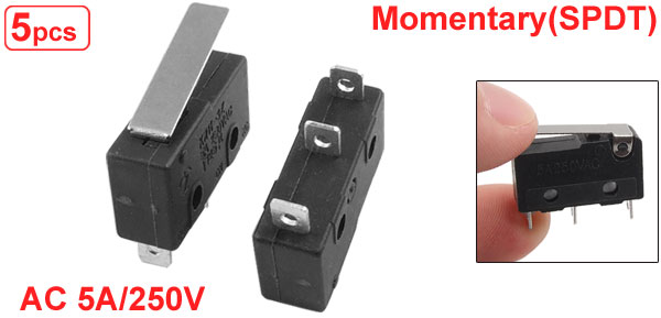 Product Name Micro Switch Voltage & Current AC 250V 5A Poles SPDT Contact Type 1NO + 1NC Action Type Momentary Actuator Type Lever Arm Terminal Type 3-Pin Terminals Overall Size 20 x 6.5 x 13.5mm / 0.79" x 0.26" x 0.53" (L*W*H) Mounting Hole Dia. 2mm / 0.08" Mounting Hole Spacing 10mm / 0.39" Pin Pitch 7 x 9mm / 0.28" x 0.35" Lever Arm Size 17 x 4mm / 0.67" x 0.16" (L*W) Material Plastic, Metal Color Black, Silver Tone Total Weight 12g Package Content 5 x Micro Switches - Reviews