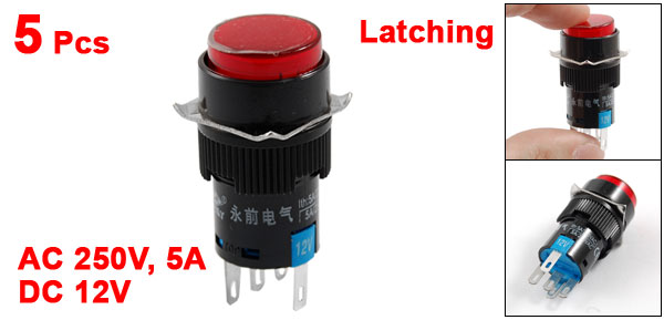 5 x DC 12V Red Light 5P Latching Panel Mount Round Push Button Switches