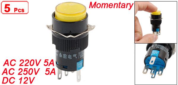 5 x DC 12V Yellow Light 5P Momentary Panel Mount Round Push Button Switch