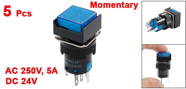 Item Name Push Button Switch Type Momentary, 1NO 1NC Switching Voltage AC 250V, 5A Light Voltage DC 24V Light Color Blue Button Size 15 x 15mm/0.6" x 0.6"(L*W) Thread Diameter 15.6mm/0.61" Size 17 x 17 x 40mm/0.7" x 0.7" x 1.5"(L*W*H) Material Plastic, Metal Weight 36g Package Content 5 x Push Button Switch - Reviews