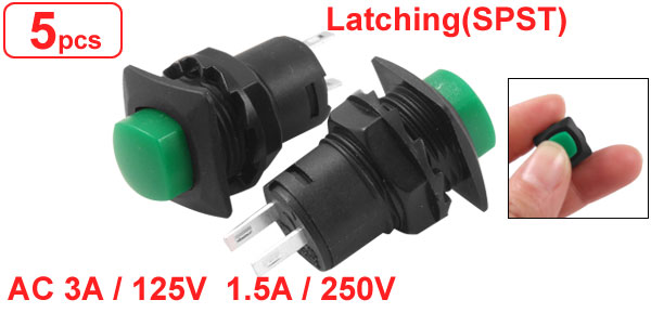 Product Name SPST Push Button Switch Action Type Latching Contact Type NO Rating Voltage AC 3A / 125V; 1.5A / 250V Terminals Quanlity 2 Pins Mounting Hole Diameter 12.3mm / 0.48" Button Size 9 x 9mm / 0.35" x 0.35"(L * W) Terminals Pitch 5.9mm / 0.232" Overall Size 15.2 x 15.2 x 30.2mm / 0.60" x 0.60" x 1.19"(L*W*H) Material Plastic & Metal Color Green & Black Weight 16g Package Content 5 x SPST Push Button Switch - Reviews